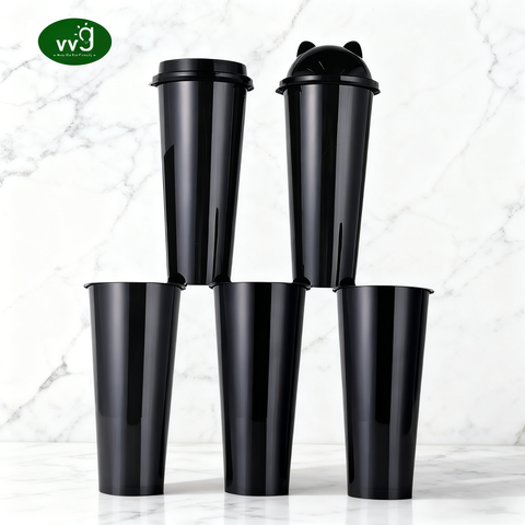 Logo imprimé personnalisé VVG 700ml/24oz Gobelets en plastique PP noir de qualité alimentaire avec dôme/couvercle plat pour le jus Bubble Tea Coffee